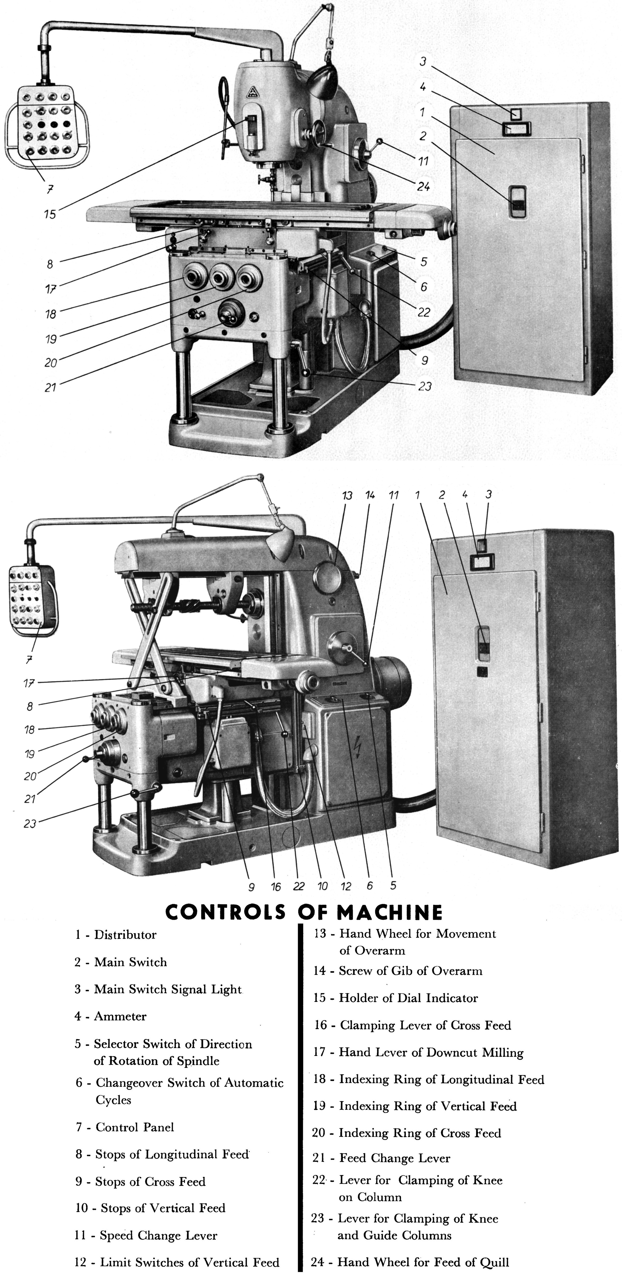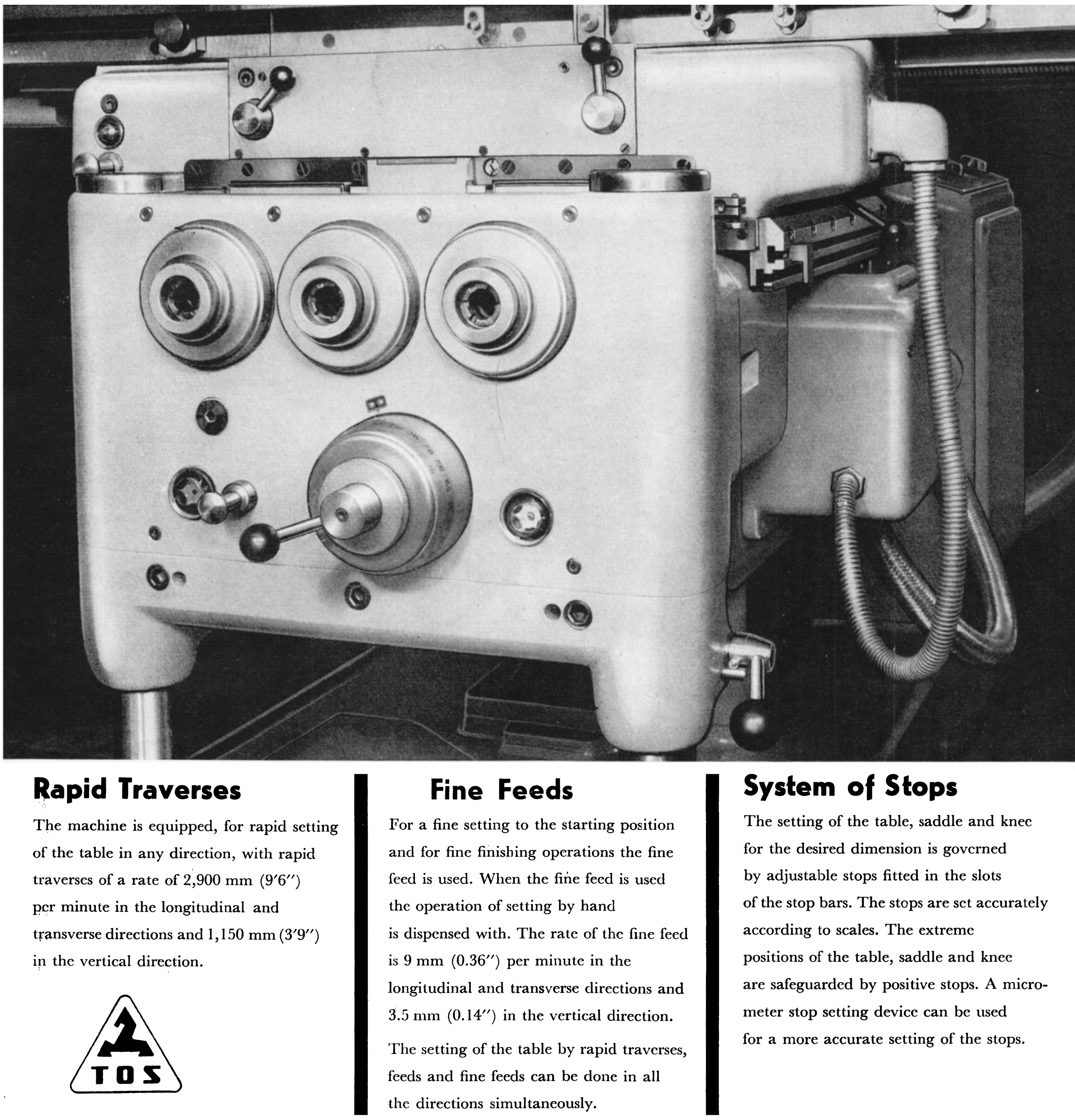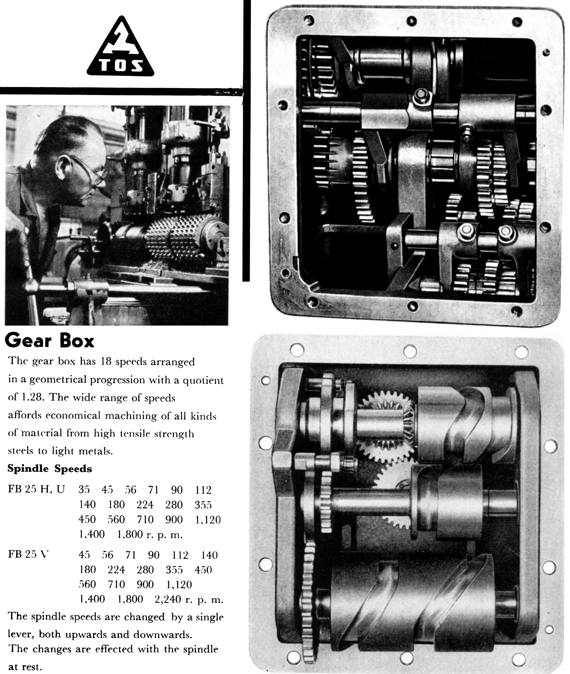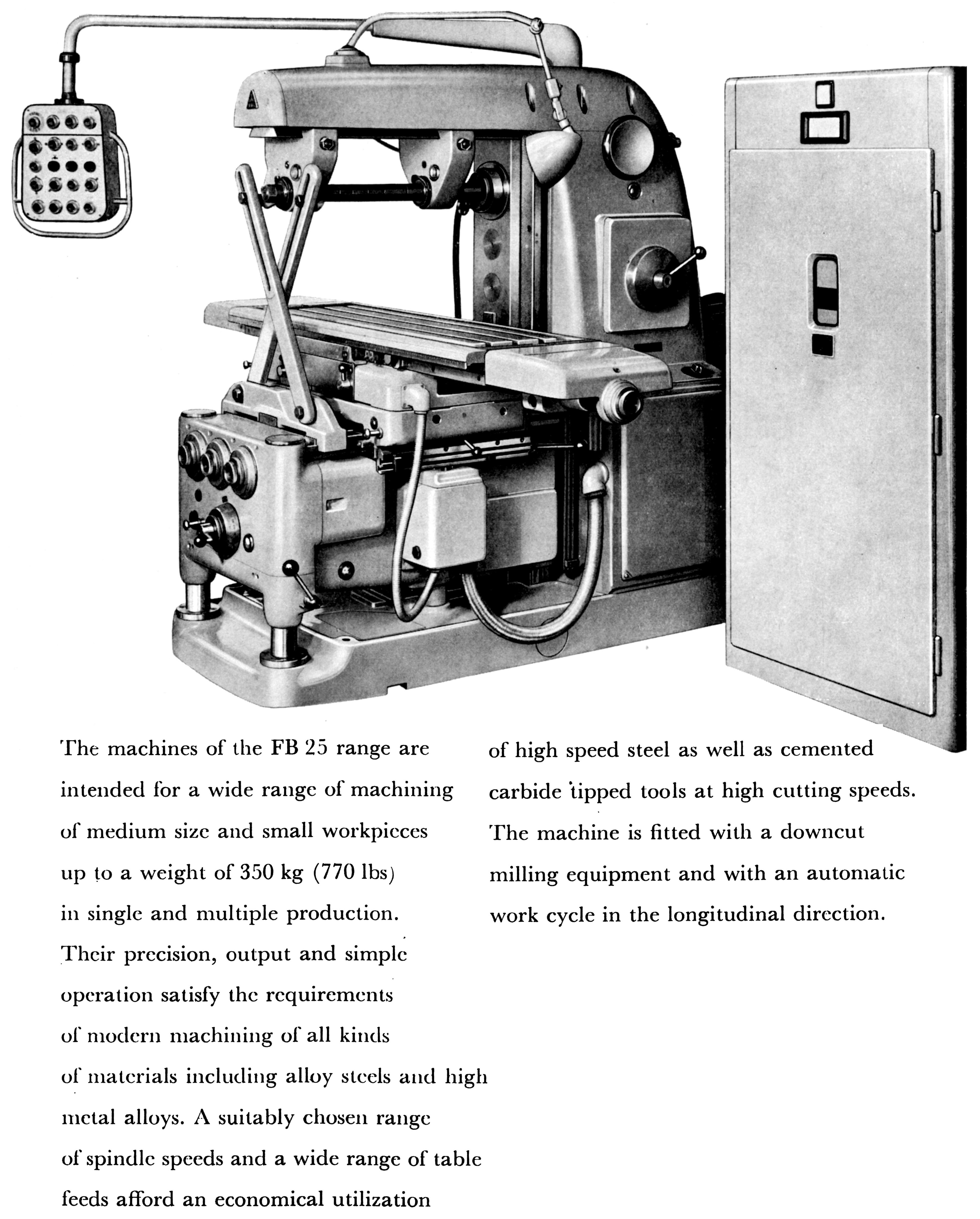 Manufactured during the 1960s into the early 1970s, the FB25 and FB32 were heavy-duty, professional machines intended for production and one-off work. Able to mount jobs up to 350 kg in weight and weighing just under 3 metric tons the FB25 was build as horizontal, universal (horizontal with a table swinging 45° each side of central) and vertical models. All shared the same basic main column, motor-drive system, 5.5 kW (7.3 h.p.) motor, 1250 x 350 mm table and identical 24 rates of table feed - these being from 8 to 1600 mm per minute longitudinally and in traverse and 3.15 to 630 mm per minute vertically. All versions had 18 spindle speeds, those of the horizontal models being set at 35 to 1800 r.p.m. and the vertical from 45 to 2240 r.p.m.