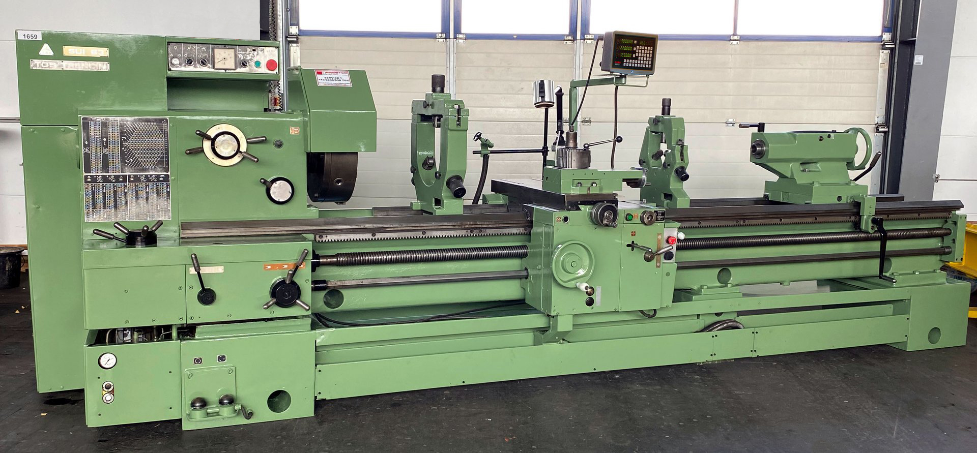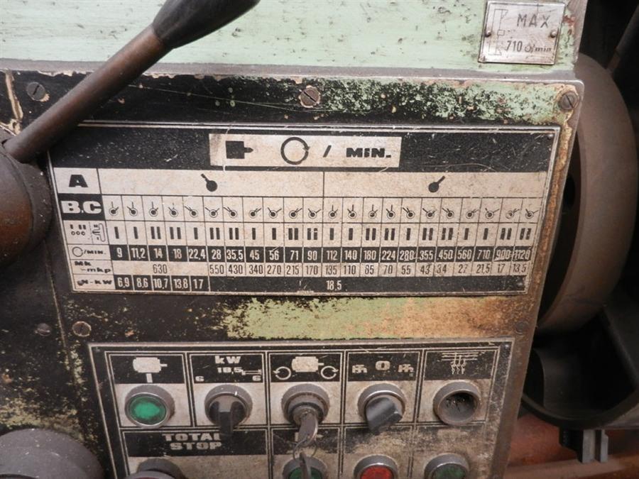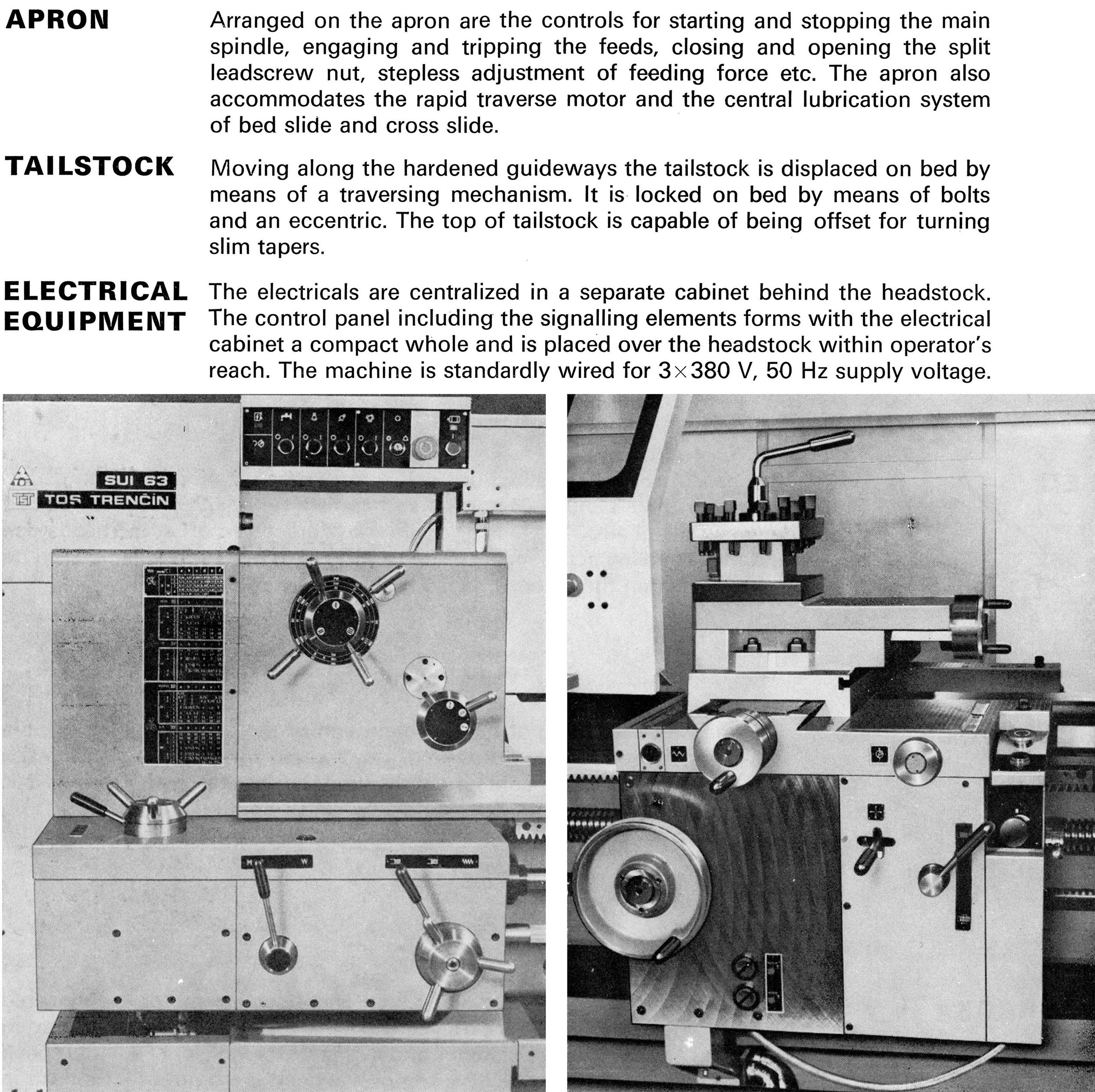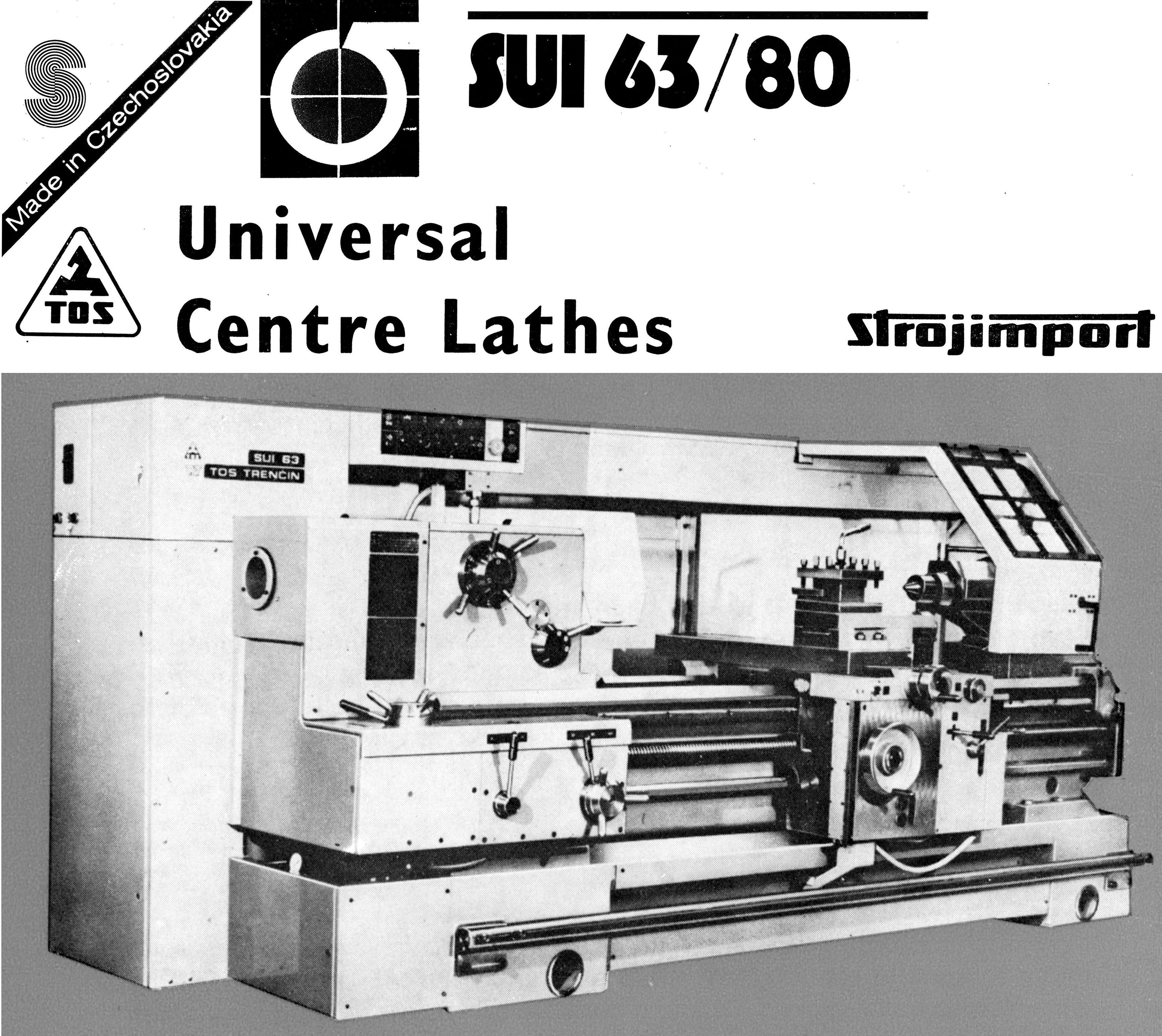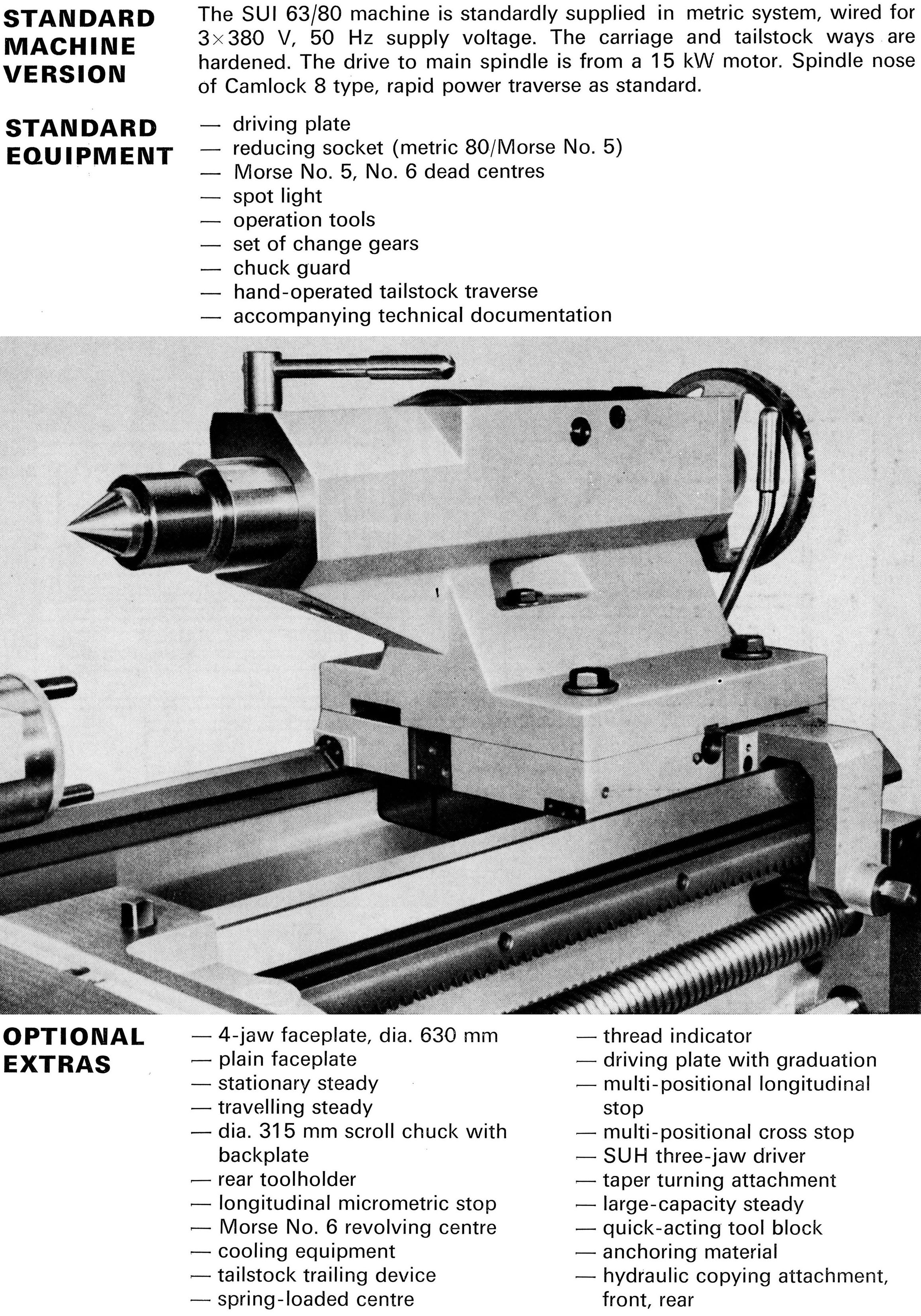 Of identical mechanical construction, save for their centre heights, the TOS SUI63 and SUI80 lathe were first offered during the early 1980s. Large and powerful machines, the two lathes took their Model names from the swing over their hardened beds, 630 and 800 mm respectively. Both shared a bed of identical dimensions - 500 mm wide - with distances between centres available for both of 1500, 2000, 3000 and 4000 mm. The lathes were able to take a workpiece between centres weighing up to 1600 kg at a recommended spindle speed of 18 r.p.m. Other than the previously-mentioned differences in capacity, the two lathes were identical with the same headstock holding a 71 mm bore spindle with a metric 80 taper, a Camlock 8 nose fitting and 18 spindle speeds from 11.2 to 1800 r.p.m. Drive came from a 15 kW motor and incorporated a combined, hydraulically-operated brake/clutch unit, Over the full spindle speed range 60 rates of longitudinal carriage feed from 0.06 to 1.55 mm/rev and 60 in traverse from 0.03 to 0.775 mm/rev were available. When restricted to spindle speeds in the range of 11.2 to 112 r.p.m., the longitudinal feed rates varied from 0.5 to 13 mm/rev and in traverse from 0.25 to 6.5 mm/rev. Rapids, driven by a separate motor built into the apron, were provided as standard on both directions of feed - the rates being 4800 mm/min longitudinally and 2400 mm/min in traverse. Screwcutting was arranged to provide 43 metric pitches from 0.5 10 160 mm, 40 English pitches from 40 to 0.125 t.p.i., 36 module from 0.25 to 48 and 42 Diametral from DP 80 to 0.375. Equipped with a large No. 6 Morse taper, the tailstock spindle was 110 mm in diameter with a travel of 180 mm The shortest bed SUI-63 weighed approximately 4950 kg and the equivalent SUI-80 5180 kg. The full specification of the two lathes - and details of the various options - can be found below..