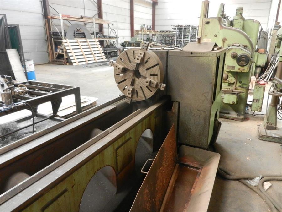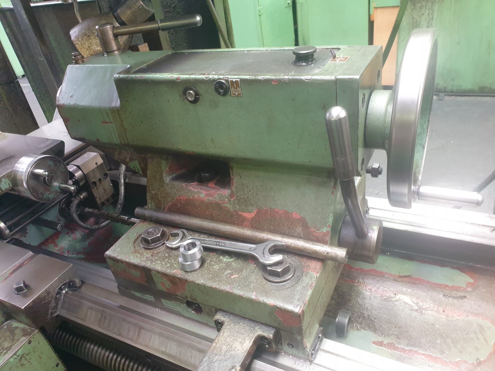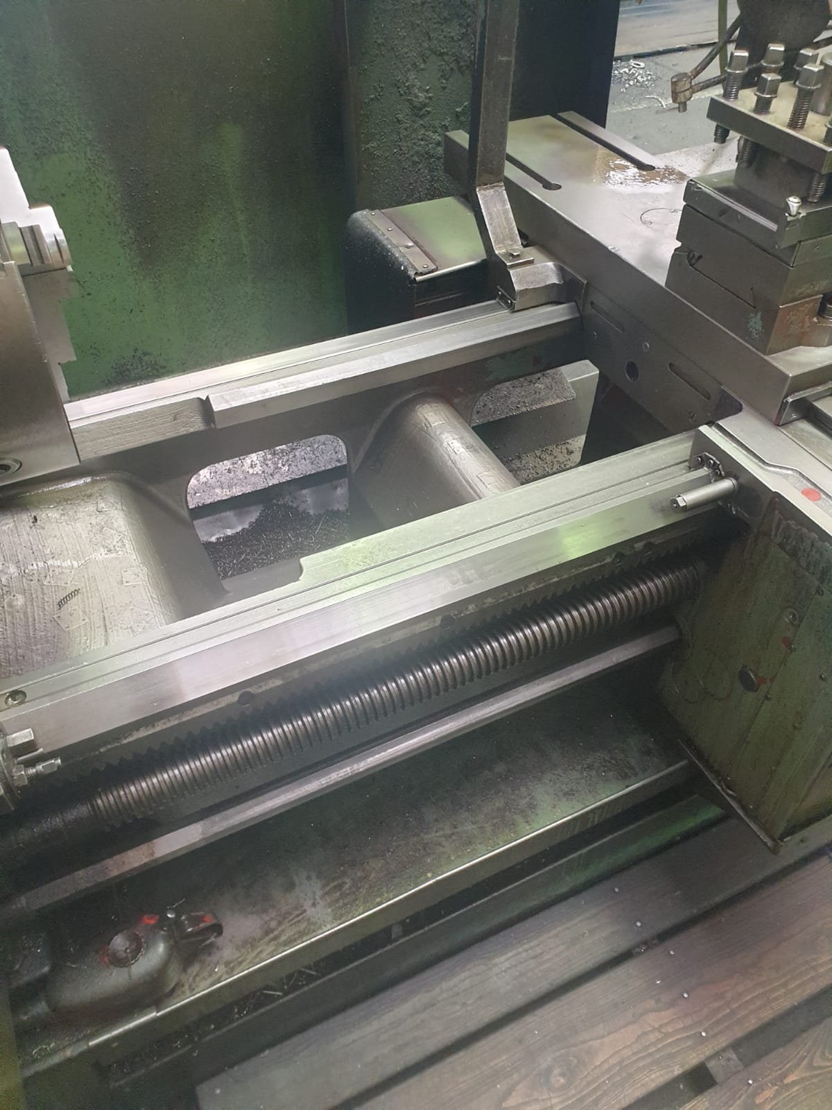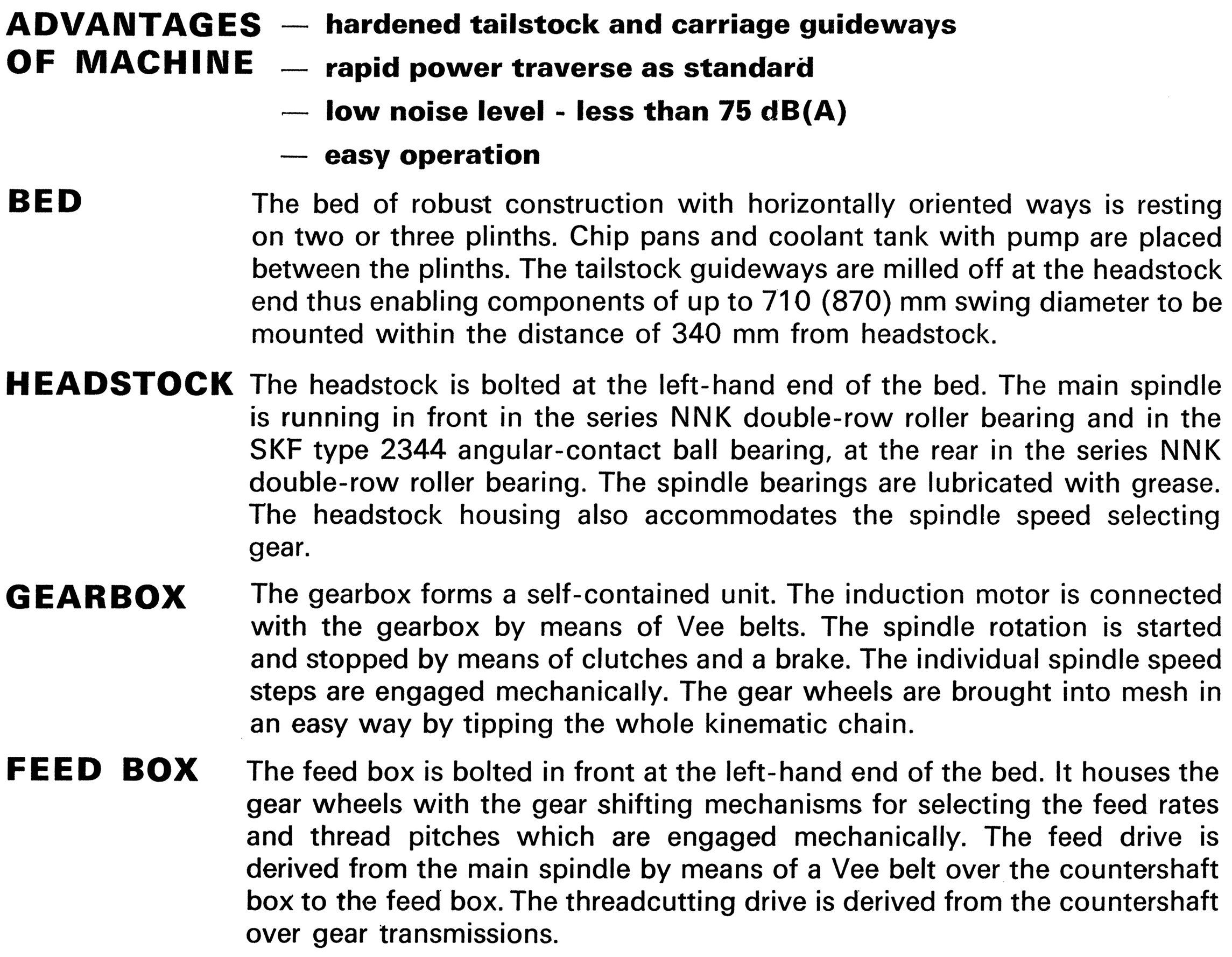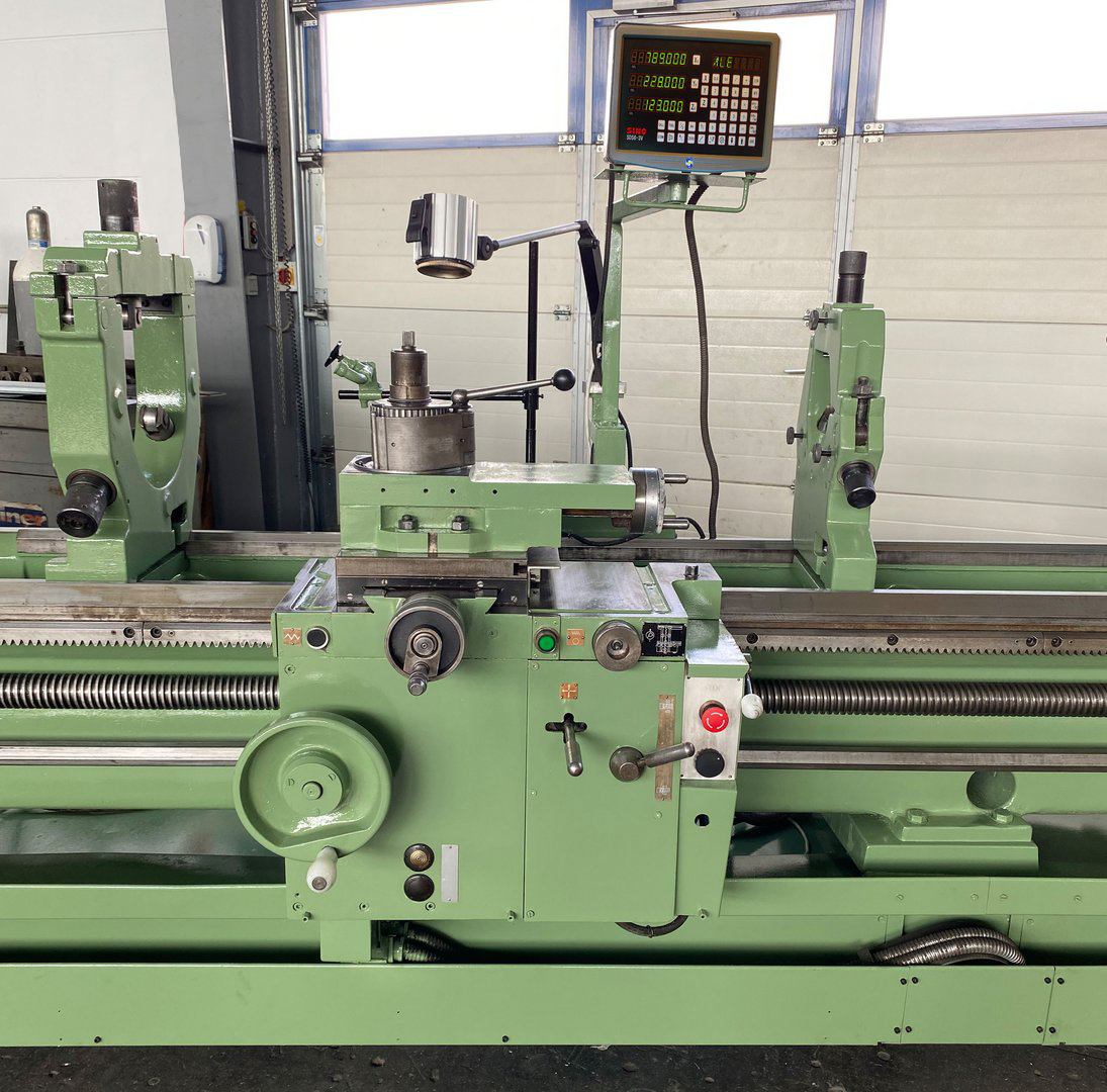Of identical mechanical construction, save for their centre heights, the TOS SUI63 and SUI80 lathe were first offered during the early 1980s. Large and powerful machines, the two lathes took their Model names from the swing over their hardened beds, 630 and 800 mm respectively. Both shared a bed of identical dimensions - 500 mm wide - with distances between centres available for both of 1500, 2000, 3000 and 4000 mm. The lathes were able to take a workpiece between centres weighing up to 1600 kg at a recommended spindle speed of 18 r.p.m. Other than the previously-mentioned differences in capacity, the two lathes were identical with the same headstock holding a 71 mm bore spindle with a metric 80 taper, a Camlock 8 nose fitting and 18 spindle speeds from 11.2 to 1800 r.p.m. Drive came from a 15 kW motor and incorporated a combined, hydraulically-operated brake/clutch unit, Over the full spindle speed range 60 rates of longitudinal carriage feed from 0.06 to 1.55 mm/rev and 60 in traverse from 0.03 to 0.775 mm/rev were available. When restricted to spindle speeds in the range of 11.2 to 112 r.p.m., the longitudinal feed rates varied from 0.5 to 13 mm/rev and in traverse from 0.25 to 6.5 mm/rev. Rapids, driven by a separate motor built into the apron, were provided as standard on both directions of feed - the rates being 4800 mm/min longitudinally and 2400 mm/min in traverse. Screwcutting was arranged to provide 43 metric pitches from 0.5 10 160 mm, 40 English pitches from 40 to 0.125 t.p.i., 36 module from 0.25 to 48 and 42 Diametral from DP 80 to 0.375. Equipped with a large No. 6 Morse taper, the tailstock spindle was 110 mm in diameter with a travel of 180 mm The shortest bed SUI-63 weighed approximately 4950 kg and the equivalent SUI-80 5180 kg. The full specification of the two lathes - and details of the various options - can be found below..