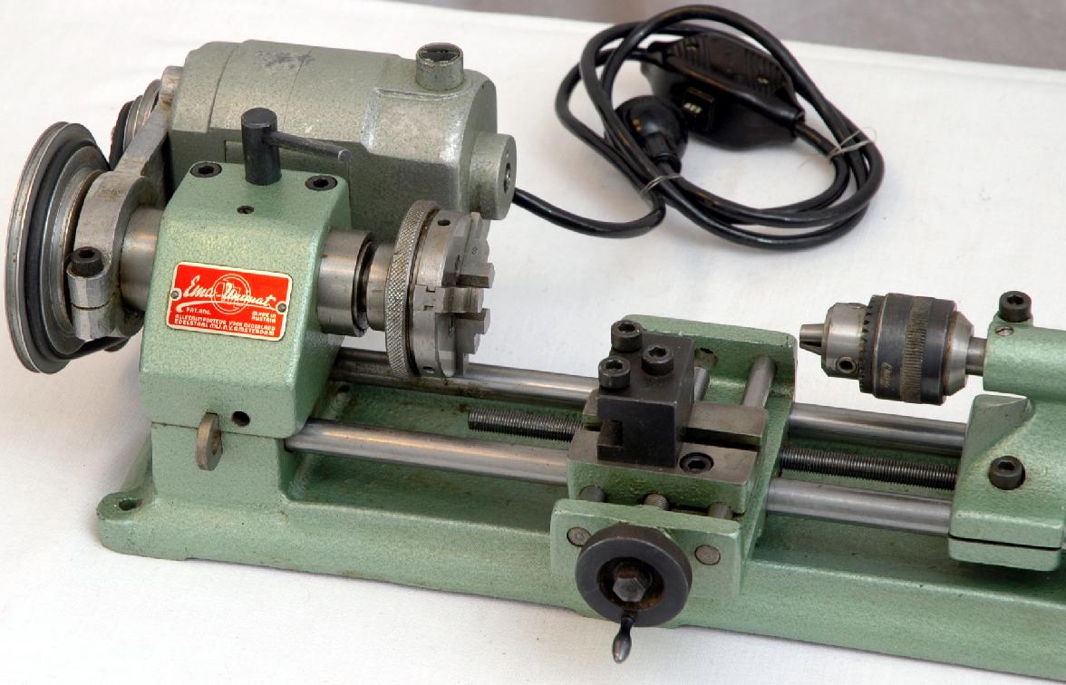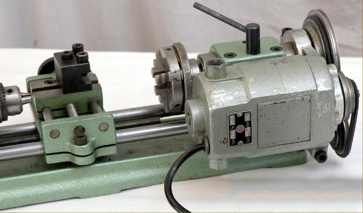 Unimat Mk. 2B: although the major components continued unchanged this version it was the first to incorporate a means of aligning the headstock with the bed bars. Upon first assembly the base casting and headstock were jigged and a small vertical slot cut across the junction of their front faces. When the faces were correctly aligned (by using the tailstock method previously outlined) it was possible to insert into the slot a small "setting piece" - a disc washer given by the handbook as being 0.748" in diameter. However, one measured has been discovered to have an OD 0.734", and ID 0.333" and a thickness of 0.1577". Whilst the OD and ID are plain machined the flats were ground). Mk. 2B …. The handbook instructions differed edition to edition, but the following is probably the clearest given: "...two corresponding grooves have been milled in the bed and the headstock housing. If, with the tension screw (No. 4 Fig. 1) slackened, you insert the accompanying setting piece (no. 55) (disc washer 0.748" in diameter) in the milled grove and tighten the tension screw again, the headstock and tailstock will be lined up. The setting piece may be removed again after the headstock has been clamped in position." Removing the setting piece would, of course, have guaranteed its immediate loss. The motor was the now-familiar (and larger) plain-bearing Dutch unit with the centre portion painted ether black, in a colour to match the rest of the machine or silver. Several styles of handwheel were used, all turned from steel and plated silver or black. Towards the end of the Mk. 2B production run it is believed that the first of the new (and cheaper to produce) die-cast handwheels with the delightful "wasp-tail" handles was introduced. Some versions of this lathe have been found with two locking screws on the cross slide, one in the normal position nearer the front and the other in line with it further back. Realising that one 6 mm screw clamping the casting to the slide bar was entirely adequate, Emco did not persist with this modification. Unimats of this age were also given a more robust carriage assembly with the whole of the casting, including the front and back walls through which the way-bars passed, noticeably thickened. Colours, as ever, pose a problem and instead of a single, standard finish crackle-black (see lower down this page) examples have been found in a light plain (flat) grey and others in either silver-blue or silver grey - with the latter two in a "hammer-effect" paint..