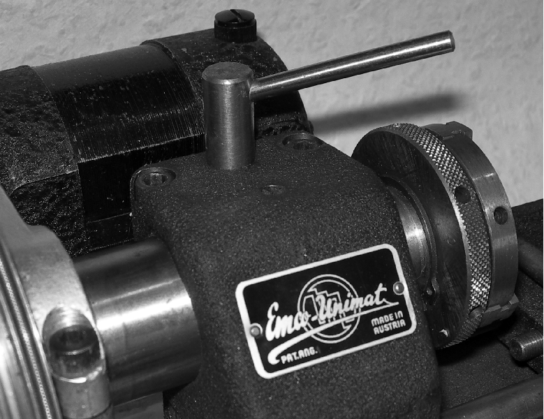 Rare and now highly-prized, this Emco Unimat is of the very first type, and almost certainly manufactured in 1954. Identification points include: crackle-black paint finish; short bed with the rails fitting into holes at the tailstock end; a nut holding the tailstock barrel in place; one-piece tailstock with a marked cantilever to the rear; no carriage lock and narrow drive pulleys with the largest diameter on the spindle to the inside - though the pulley on the motor in the example above may be non-original. This example, unlike others seen - and probably becase it came from a faulty pattern - it has flat tops to the front and rear walls of the cross slide casting and a crudely-finished radius where the top and front faces of the headstock meet.