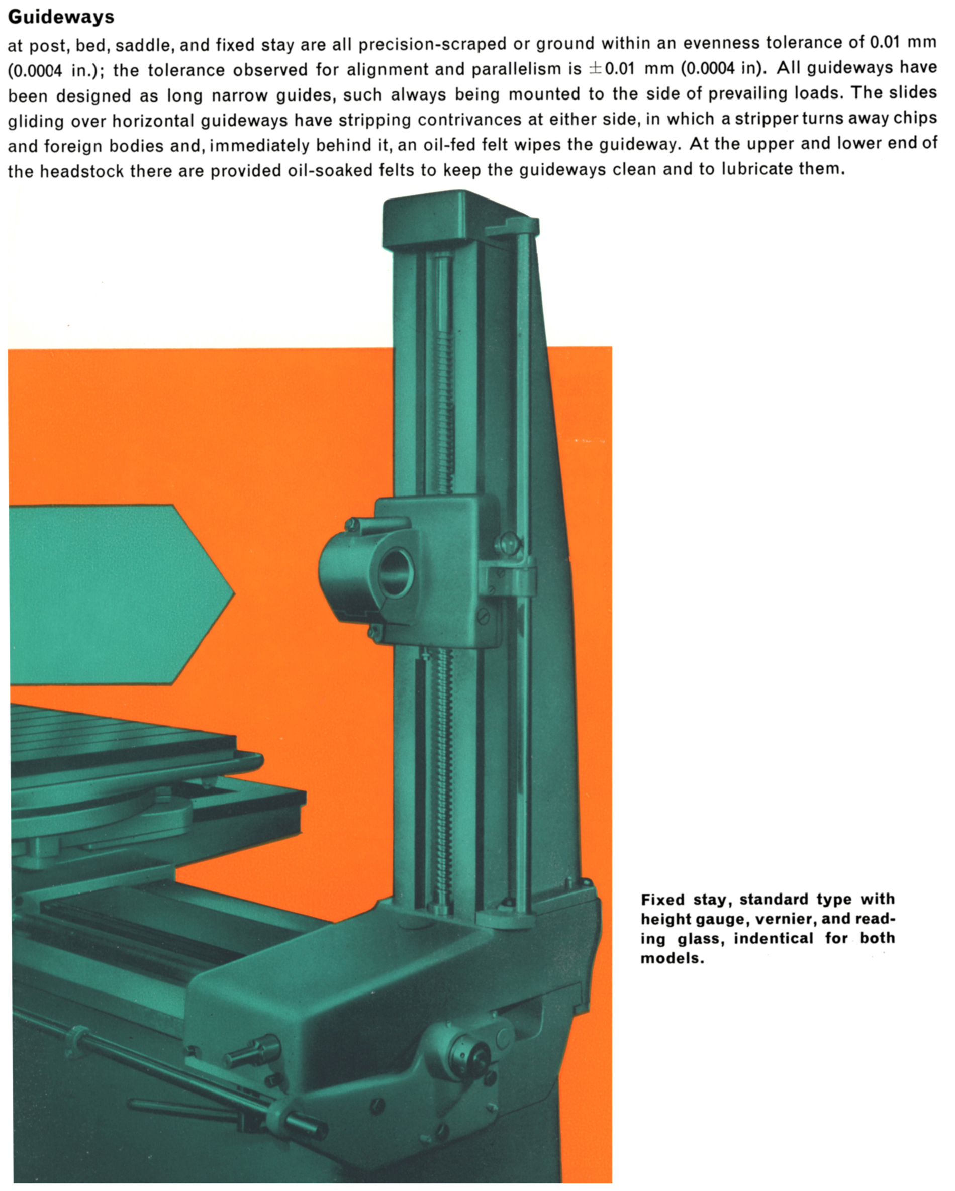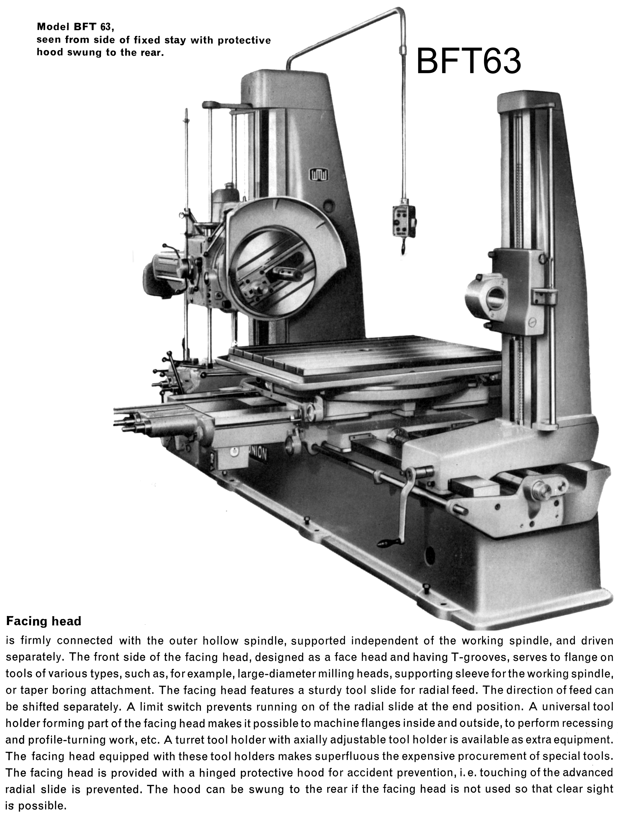 Made from the early 1950s - the first (Mk.1) types can be recognised by exposed pulleys on top of the main column- the BFT63 and BFT80 were to be built in two further very similar forms, the earlier of these (the Mk.2) being recognisable by its lighter "rounded" end steady, and the lack of an Ammeter on the headstock. The later Mk.3 had an end steady of considerably greater mass with a distinctive flat top, the speeds and feeds chart moved from its previous position of the curved front face of the headstock to a rectangular plate on the long extension to the left and a number of minor alterations to the controls including, on most models, red knobs instead of black on the control handles - these alterations first appearing in a Union WMW catalogue during 1963. However, although the styling and some minor details might have changed, in virtually every other respect the two machines were identical in both their mechanical design and work capacity. Catalogue extracts for later Mk.3 model are shown below on this page and many for the earlier Mk.2 on this page. In 1966 the BFT63 and BFT80 were both superseded by yet another pair of machines - again each of the same design except for their capacity - the BFT80/2 and BFT 90/2..