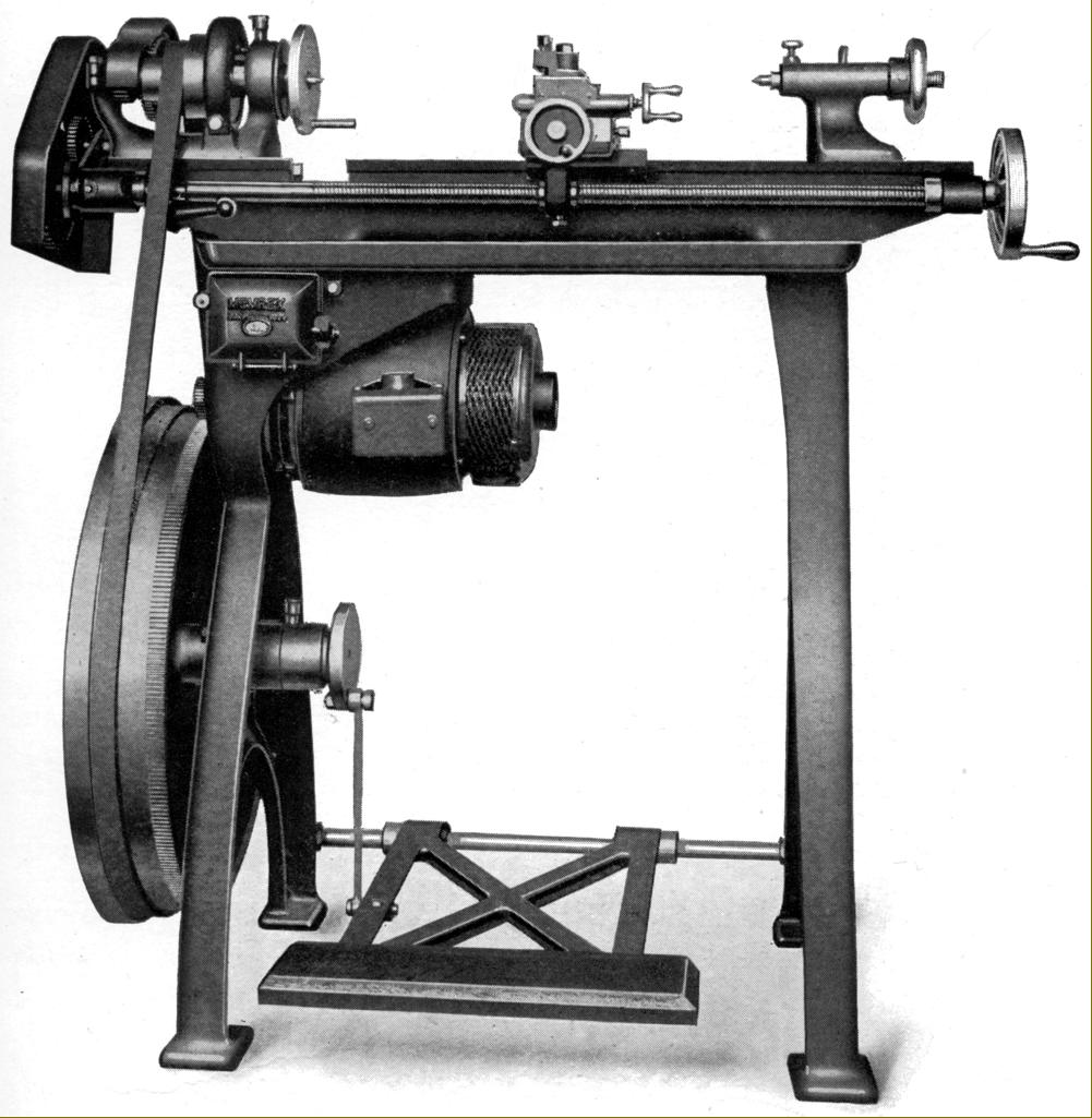 An early Light Pattern 6-inch lathe--probably from the 1920s. Unlike the later models that used a "frictionless" chain drive from foot pedal to flywheel this version was equipped with a plain bushed rod