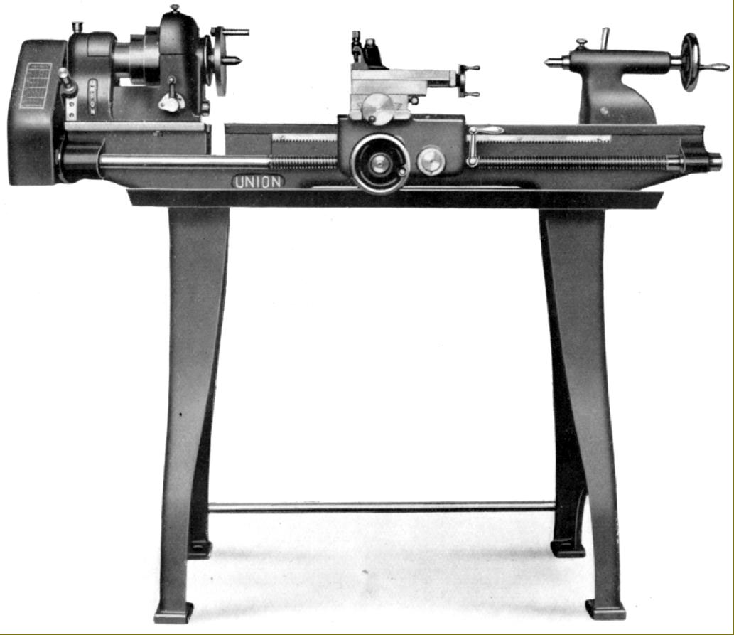 1930s and 1940s 5-inch backgeared and screwcutting Union L.2.A.S. lathe with single-lever backgear, tumble reverse, detachable gap bed and clasp-nuts on the apron. This art-worked publicity pictures gives an impression of smooth finishes and neat detailing - the reality, as shown in the photographs further down the page - was rather different