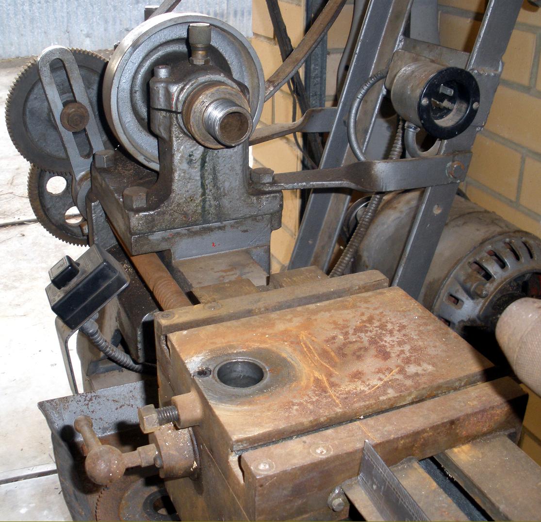 Resident in Australia, this simple 4.5" x 16" non-backgeared but screwcutting lathe was obviously built for amateur use. Dating from the 1920s, it has the usual economical construction with a single, T-slotted swivelling toolslide pivoting on a T-slotted boring table simple spilt headstock bearings (supporting a spindle with a good-sized hole) and a flat-topped bed with 60° edges. However (and rather unusually), the apron was heavily built and held reduction gearing between the carriage handwheel and bed-mounted rack - together with proper clasp nuts for the leadscrew.