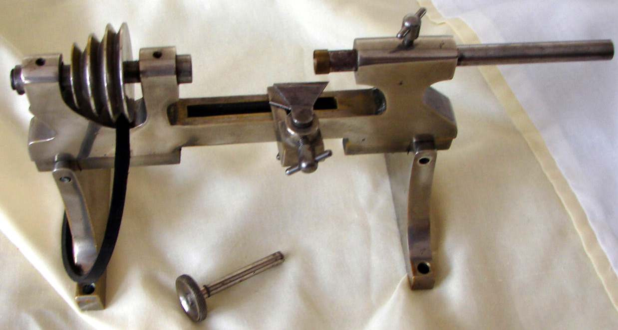 Thought to be of British manufacture and off the very simplest, most basic kind - with both the 8 mm collet headstock headstock and tailstock both immovable and formed as part of the bed - this "watchmaker's lathe" almost resembles a large set of "turns". All the major casting are in nickel-plated bronze, including what must be a unique design of detachable bed feet. One can only guess at the year of manufacture - possible the 1930s or 1940s -when a such a huge variety of lathes for watchmakers was available both new and second-hand from long-established makers (together with vast ranges of essential accessories), that one wonders which market segment the maker of this very simple lathe had in mind..