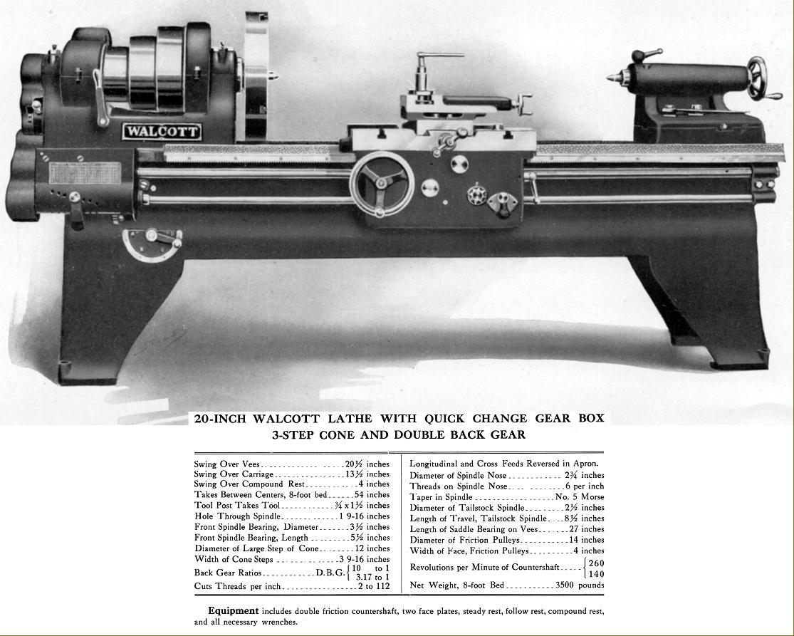 Founded in 1881 as Walcott & Son, the Company became, after a reorganisation in 1907, the Walcott & Wood Machine Tool Co and finally the Walcott Lathe Company . Also well-known in early years for their shaping and rack-cutting machines, by 1908 a new range of up-to-date lathes with a Norton quick-change screwcutting and feeds' box had been introduced - the 14", 16", 18",20", 20" and 26" lathes shown on this page, dating from the period 1916 to 1925, being the successors to those models.