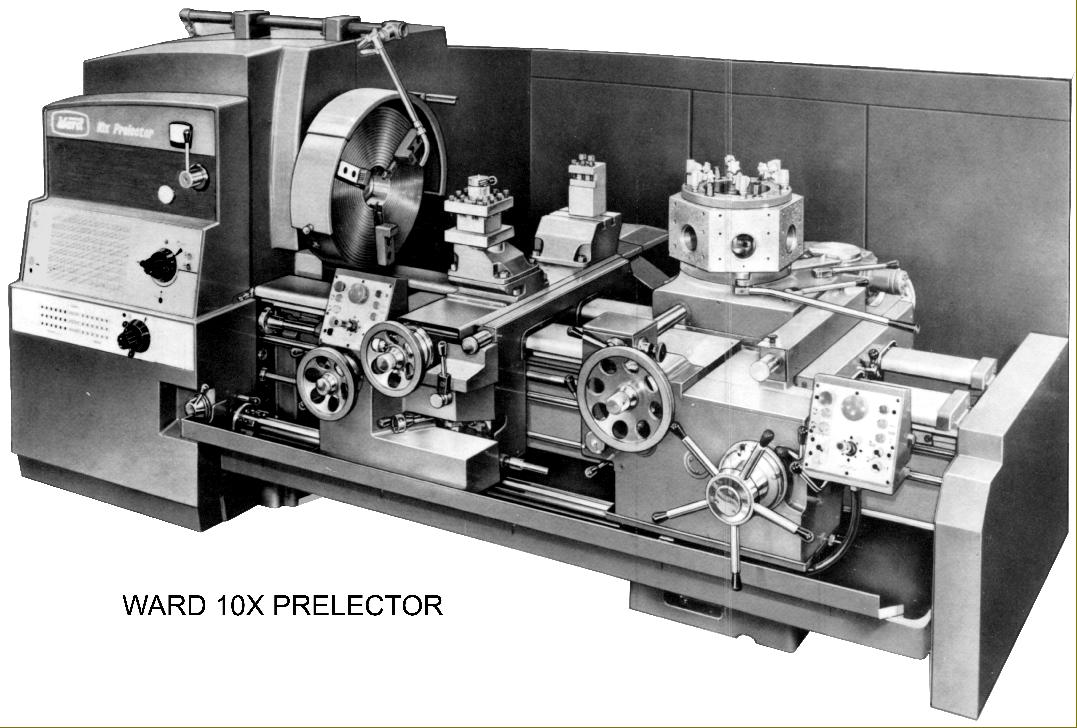 This is one of a series of articles that will illustrate and detail most Ward turret and capstan lathes manufactured from the 1940s until the 1970s. A logical development of the basic backgeared and screwcutting centre lathe, the "turret" or "capstan" type made its first appearance in the mid 1800. Copied, refined and modified by numerous makers, by 1900 it had reached an advanced stage of development and (by then the ubiquitous production machine tool), was in widespread use by all developed countries. In 1889 a group of engineers took over premises in Ladywood Road, Edgbaston, Birmingham and began manufacture of various kinds of industrial machine tools including drills, grinders and capstan lathes. Finding almost immediate success the enterprise became known as H.W.Ward and was to offer their first "combination" turret lathe at the Paris exhibition of 1900. A "combination" turret or capstan lathe is one where the turret head is not only mounted on the usual short slide, to give the necessary tool travel, but also carried on what amounts to an ordinary lathe saddle that allows much longer work to be undertaken. In addition, ordinary changewheel or gearbox-driven power feeds and screwcutting are easily included, so adding even further to its versatility. By 1895 Ward had moved their works to Lionel Street and, in 1908, became a Limited Company (or "Incorporated" using American parlance) allowing share capital to be raised and expansion undertaken. During the early years of the 20th century it was common for machine-tool makers to compete in as many market segments as possible, so diluting their expertise across many product ranges. In line with many other engineering concerns of the time, Ward decided, in 1912, to concentrate upon one speciality, in their case capstan and turret lathes and their associated tool holders, tooling and accessories. As a consequence of this decision, new premises were acquired at Selly Oak, Birmingham, in the heartland of the industrial Midlands - though as the new works were too small to cope with an ever-increasing demand for Ward products, the factory in Lionel Street (just a two-minute walk from the Town hall) was retained for a number of years. As sales grew even further factory extensions were added in 1924, 1928 and 1932 and, then, to rationalise production and increase efficiency, an entirely new factory was built in 1936 at Blackpole, Worcester - works that were to be eventually increased in size to over 150,000 sq. ft. and destined to manufacture capstan lathes below the Number 7 in size together with tooling and accessories. Selly Oak, of a similar size, were then free to build the No. 7 and larger lathes. During the 1920 increasing use was being made of very hard tungsten-carbide cutting tools, this leading to a demand for much stronger, more rigid machines able to take advantage of the new material As a consequence, beginning in 1928, Ward began redesigning their entire range and incorporating heavier castings, improved alloy steels, stiffer ball and roller-bearing spindles, stronger and quieter-running ground-finished gears and shafts, generally larger bearing areas and wider bed ways together with improved covers to guard against the ingress of dirt and swarf. Bar-feeding mechanisms were improved and much work done to on work-holding and chucking systems with the adoption of electrical, air and hydraulic actuation. Swarf, with increasing rates of metal removal, became a real problem and modifications made to improve both storage and removal systems. Although lathes driven by flat belts continued to be offered during the 1930s - many factories retained their old-fashioned overhead line shafting - increasing numbers of self-contained, geared head lathes were sold, these not only being more powerful but also able to be moved and grouped for best efficiency so that time wasted barrowing parts from one end of the factory to another was almost eliminated. By the mid 1930s a wide range of reliable, powerful lathes was in production that remained, in their basic form, largely unchanged throughout WW2 and on into the 1950s By the early 1960s the small OE and No. 1 lathes had been dropped and the Ward range consisted of some survivors from earlier times including the long-established 2A, 3A, 7, 8, 10, 16 together with five newcomers: the 2DS, 3DS and 7D (DS standing for "double slide") the 7 "Prelector" (this having a pre-selector speed change on the headstock) and the No. 10/13. Ward full-range catalogues printed until the late 1930s were usually in the form of comprehensive, hard-backed volumes that not only listed and illustrated the various models but also gave considerable information about their construction and operation. Typical was that for 1929 with 255 pages, beautifully illustrated, highly detailed with data about the various tools and accessories available and how they were to be employed. The catalogues were always given an edition number that matched the year of their publication hence, that for 1929 was listed as Edition 29 and that for 1950 as Edition 50, etc. Even the individual machine brochures were so numbered, with the style of these changing little from the late 1920s until the late 1950s..