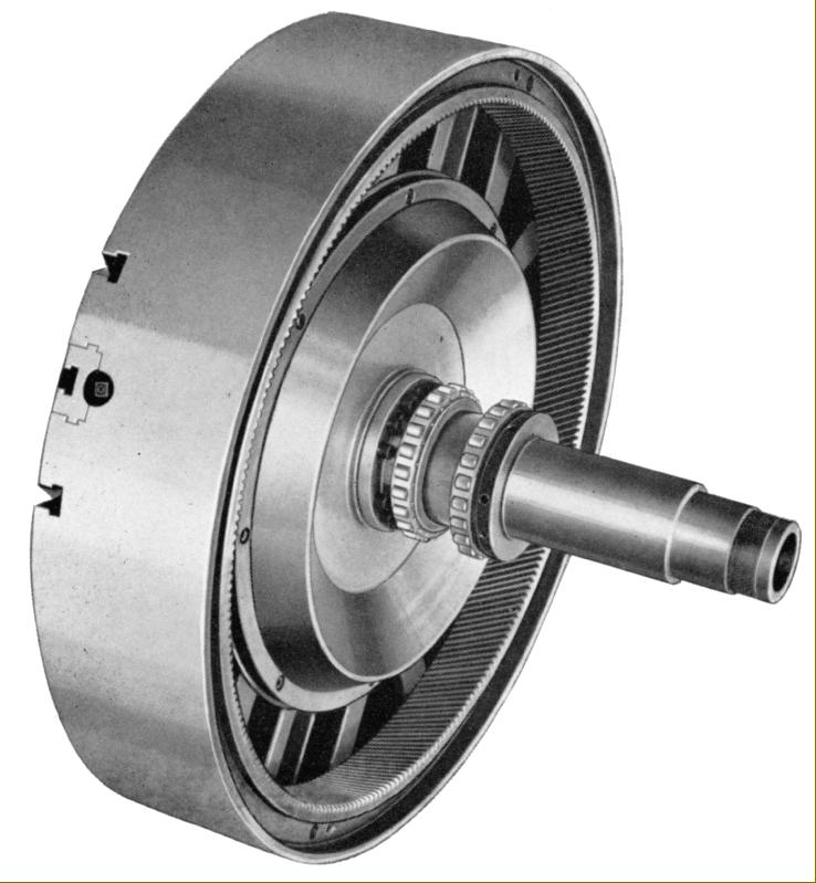 Larger models in the 48-inch, 60-inch and 72-inch sizes had their work-holding chuck carried on a forged steel spindle supported in parallel roller bearings for radial loads with thrust taken, in this case, by a large diameter, pressure lubricated plain bearing of the conical type. However, depending upon the speed range and class of work for which the machine was intended, a flat version was also manufactured