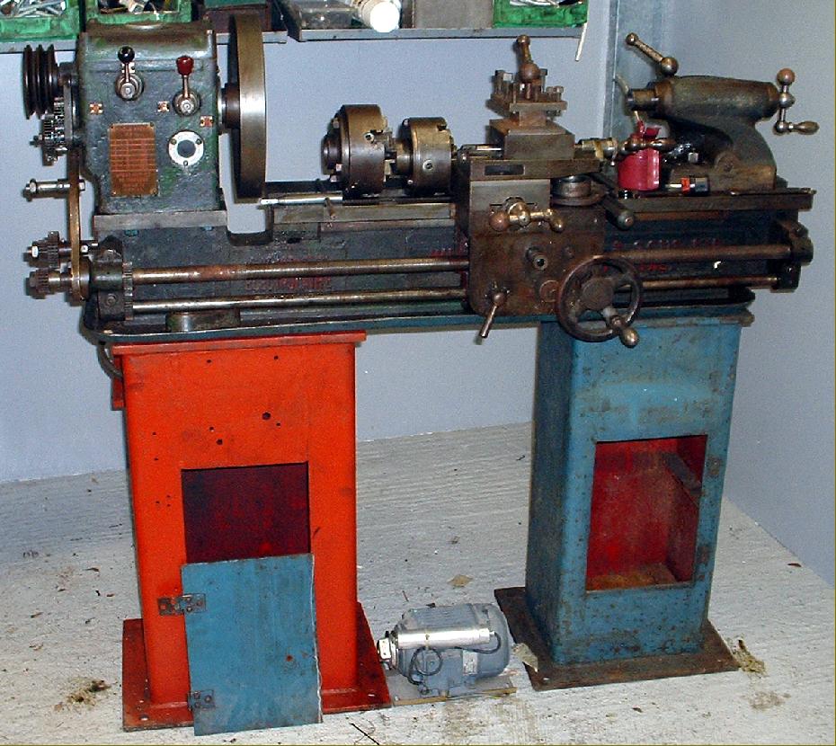 A simple backgeared and screwcutting Electrolathe. Although it has an unusually deep bed for an inexpensive lathe both the design and detailing look poor. The cross slide is mounted to the extreme left-hand side of the saddle (to reach across the gap bed); the changewheels are carried on a single curved bracket (making the assembly of a compound gear train awkward); there appears to have been no attempt to mount a changewheel guard and the covers over the backgears are perfunctory. In it's favour are reasonably large diameter spindle bearings, a generous distance between centres, a good cast-iron 3-step headstock pulley--and a nice badge.