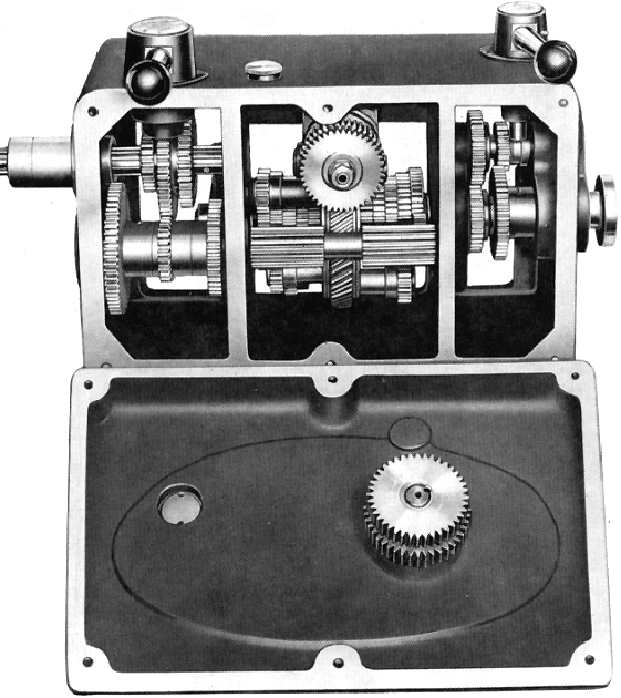 Willson's most successful lathe in this size during the 1950s and 1960s, the Mk. V 71/2" x 30" was strongly built, with a useful 2" clear bore through the headstock and nine spindle speeds which were available in three ranges: 39 to 716 rpm, 26 to 477 rpm or 52 to 954 rpm - all rather slow by today's standards but perfectly suitable for the cutting tools in use at the time. The spindle terminated in an American L1 keyed taper which meant that, for the first time, the lathe could be run safely at high speed in both forward and reverse. All the headstock spindles were mounted on either ball or roller races and a 4-grove V-belt pulley supplied power to the headstock input shaft from a 5 h.p. motor mounted on an adjustable platform hinged to the back of the bed. The hardened bed could be supplied straight, as illustrated, when the machine was coded as the "Canel Mk.V" - or fitted with a gap, as the "Newel Mk. V" Of conventional pattern, the tailstock was incorporated an extra clamping bolt underneath the handwheel for heavy-duty work. Two types of screwcutting gearbox were available: the "Standard" unit cut three ranges of English threads Fine: 28, 27, 26, 24, 23, 22, 20, 19, 18 16 t.p.i Medium: 14, 131/2, 13, 12, 111/2, 11, 10, 91/2, 9, 8 t.p.i Coarse: 7, 63/4, 61/2, 6, 53/4, 51/2, 5, 4 3/4, 41/2, 4 t.p.i A numbered dial on the gearbox front indicated the changes and one complete turn (in either direction) brought up the next number. The three thread ranges were selected by a second lever. The other gearbox was the "Universal", illustrated below, which would also cut three ranges of metric threads.