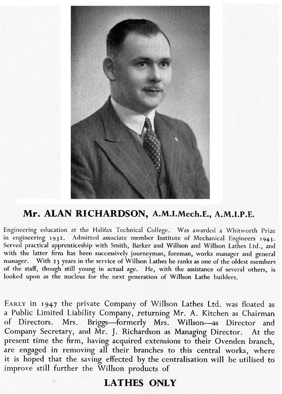The up-to-date Willson lathe shown at the Machine Tools Trade Exhibition of 1920. Contained within the left-hand cabinet leg the electric motor drove to a 6-speed gearbox with drive transmitted to a 4-speed gearbox built into the headstock - the total of 24 speeds spanning a very wide and useful range. The drive was clutched - controlled by a long bar running above and along the bed - and the lathe fitted with a separate shaft to drive the sliding and surfacing feeds, these being engaged by a star-shaped handwheel on the face of the apron. Feeds could be set for automatic disengagement by sliding stops fitted to a control rod running along the front of the bed - the latter also provided with a handle for the instant start and stop of the feed.